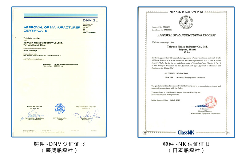 针对铸件、锻件产品,太重取得了美国船级社(ABS)、英国劳氏船级社(LR)等世界多个国家的认证证书。